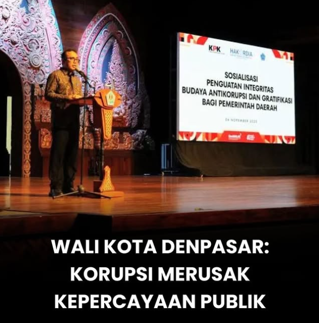 Denpasar — Wali Kota Denpasar I Gusti Ngurah Jaya Negara menegaskan bahwa korupsi merupakan ancaman serius bagi tata kelola pemerintahan dan kesejahteraan masyarakat, karena tidak hanya menimbulkan kerugian secara finansial, tetapi juga merusak moral, kepercayaan publik, serta tatanan budaya birokrasi yang berkeadilan.